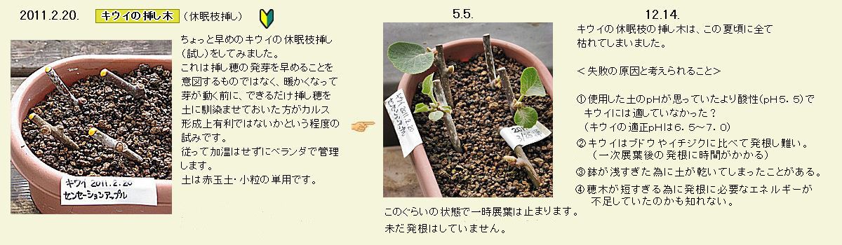 落葉果樹の挿し木は、冬の間に穂木(休眠状態)を採取し、これを冷蔵庫で保存して3月(樹液流動が始まる)頃に行うのが一般的です。 しかし、穂木の保存には冷蔵庫内の場所をとるし、温度・湿度の管理なども面倒です。 そこで、私は穂木の採取と同時に行うことにしています。 挿し木の時期:冬の気温が氷点下になることが少ない千葉市の場合は2月上旬〜下旬 土: ぶどう、いちじく、キウイフルーツなどは pH6.0〜6.5の土 例、鹿沼土(5割)+赤玉土(5割) ブルーベリーは pH5ぐらいの酸性の土 例、鹿沼土(7割)+酸性ピートモス(3割) 手持ちの土を実測したところ、「鹿沼土」pH6.3、「赤玉土」pH5.5でした |