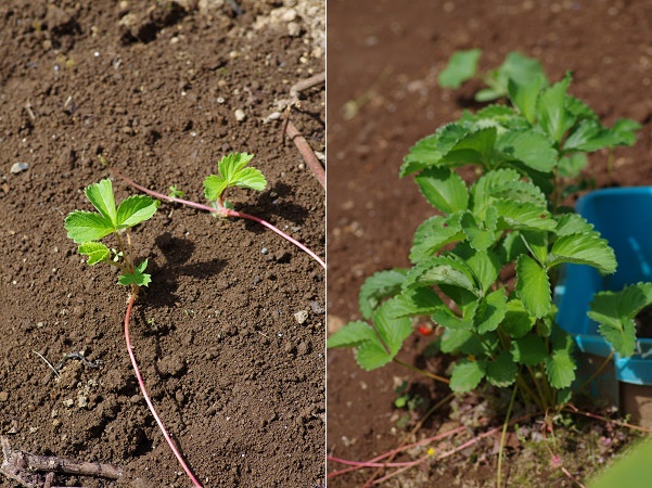 | 25.5.11. イチゴにランナー発生、のらぼうに種が出来ている |